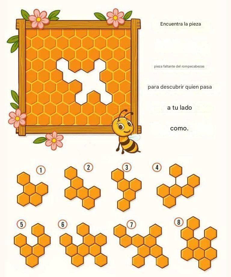 Observa atentamente las figuras numeradas del 1 al 8. Sin dudarlo, elige el patrón de panal que creas que completará el rompecabezas.