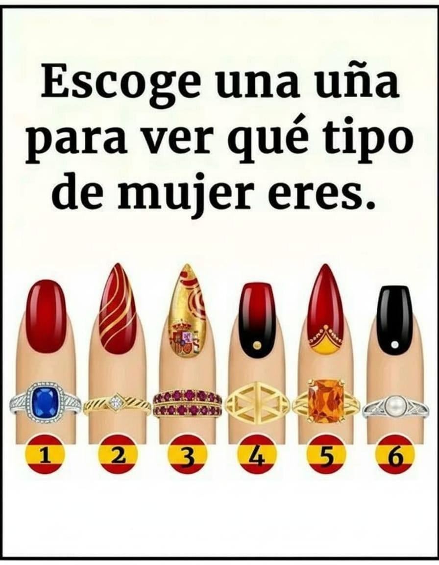 Observa la imagen con los seis tipos de corte de uña. Cada uno presenta una forma distinta, desde cortes más redondeados hasta otros almendrados, cuadrados o ligeramente puntiagudos. Elige el que más te atraiga y descubre qué rasgos de personalidad podría reflejar según tu elección. Recuerda que este test es solo para divertirte y reflexionar sobre tus gustos.